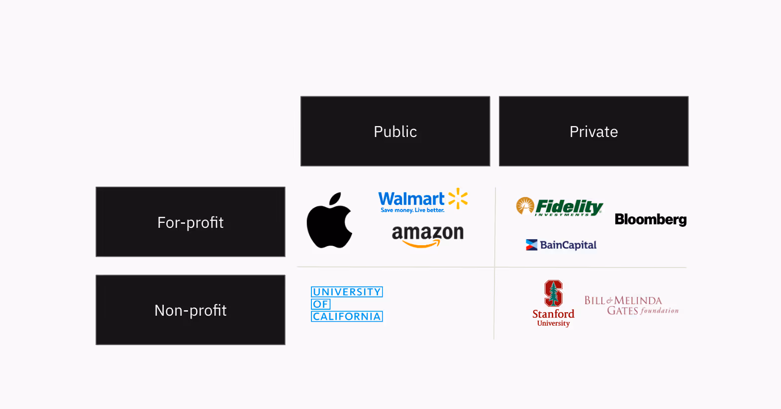 - Public for-profit companies like Apple have a distributed shareholder base that elects a board of directors by which it is governed.